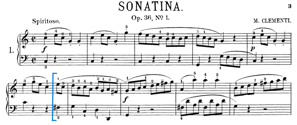 クレメンティの《ソナチネ ハ長調 Op.36-1》では、提示部の途中で主調であるハ長調から属調であるト長調に転調します。