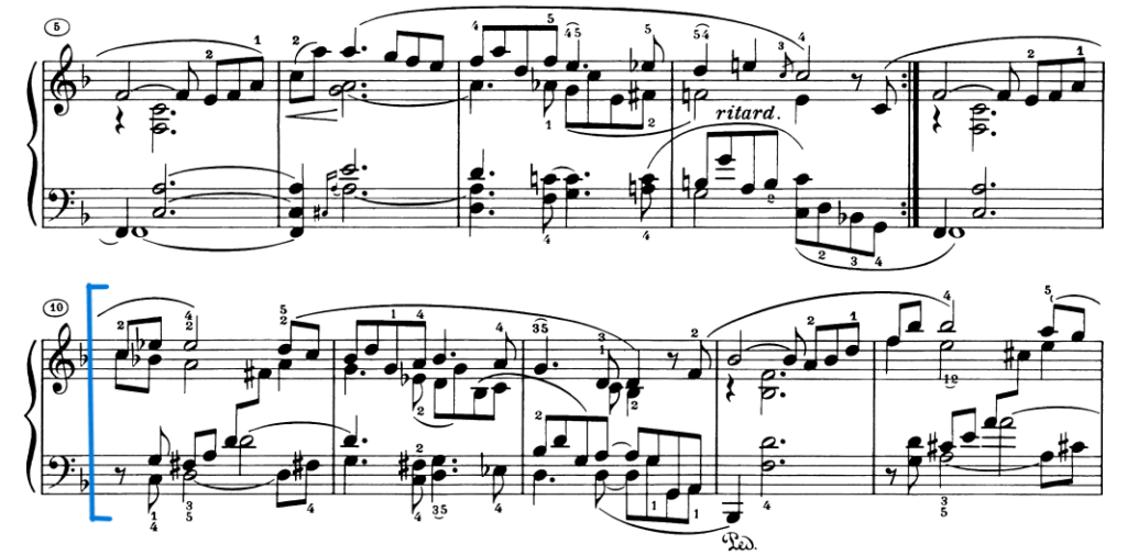 - 低音の動きを追う:左手のベースが変わる場所を意識。