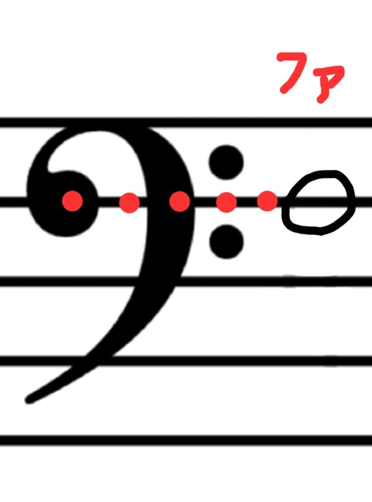 そして、その後に続く2つの点。この黒玉が乗っているライン(第4線)こそが「ファ」の音なのです。