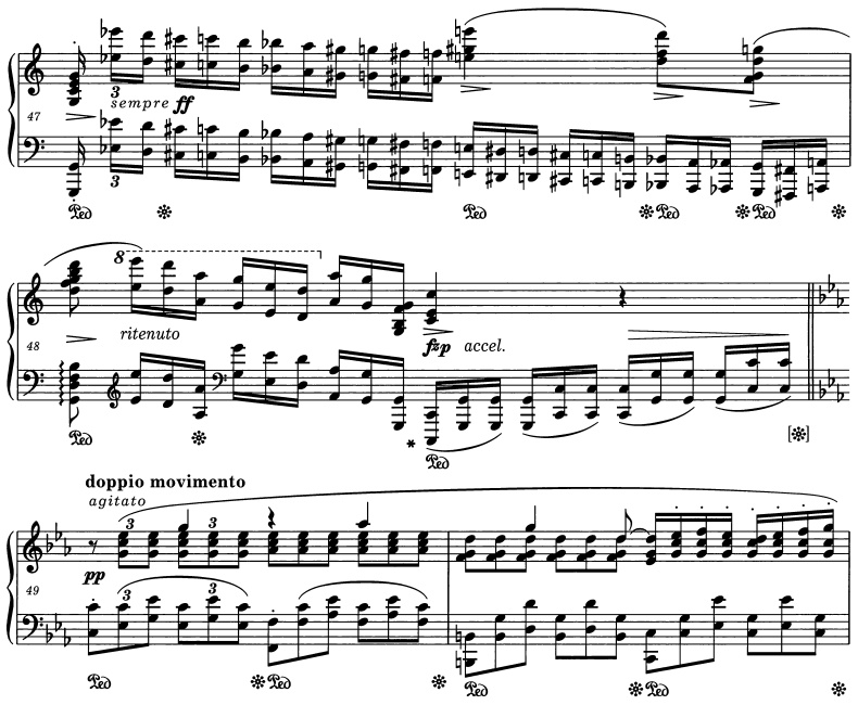 たとえば、ショパン《ノクターン第13番 ハ短調 作品48-1》の中間部の再現。